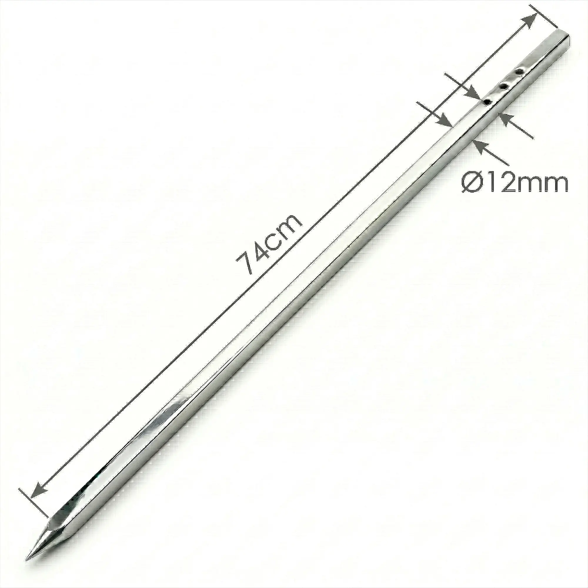 YM-1244 Döner-Kebab-Spieß (Ø12/74 cm). Professioneller Döner-Kebab-Zubereitungsspieß aus Edelstahl AISI 304 mit 3 Verstelllöchern.