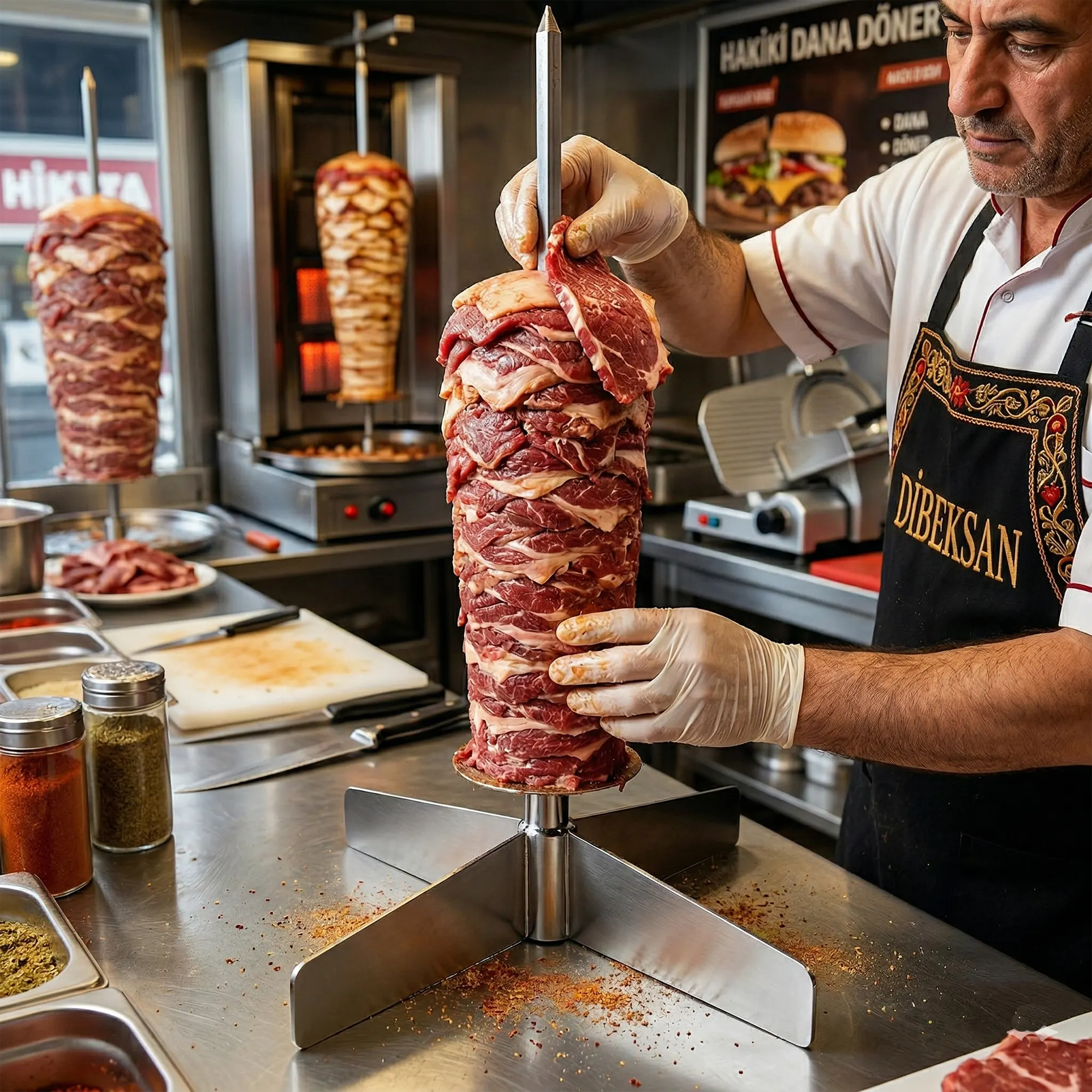 DA-34 Doner Kebab Wrapped LegDesigned with DIBEKSAN quality, it standardizes the meat wrapping (arranging) process, the most critical and skillful stage of professional döner kebab production. For the meat blocks to be prepared perfectly and without waste, suitable for the grill, the döner kebab skewer must remain completely upright and motionless. The DA-34 features a special locking slot located in the center of the base. Up to 16 mm in diameter It firmly grips and securely holds industrial doner kebab skewers in a perfectly vertical position. Without this reliable clamping device, it is almost impossible to wrap high-gramage meats evenly, symmetrically, and tightly on top of each other. The product creates a stable working area for doner kebab masters, directly maximizing production quality and speed.