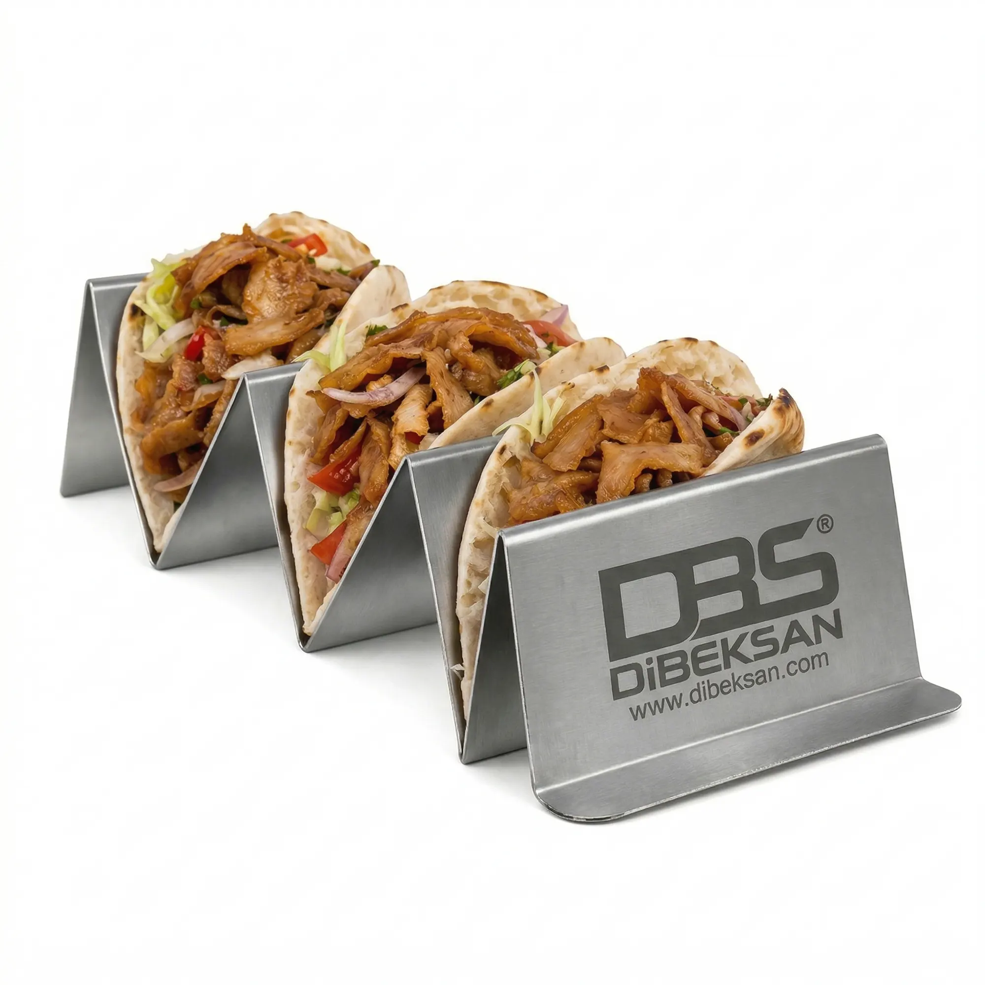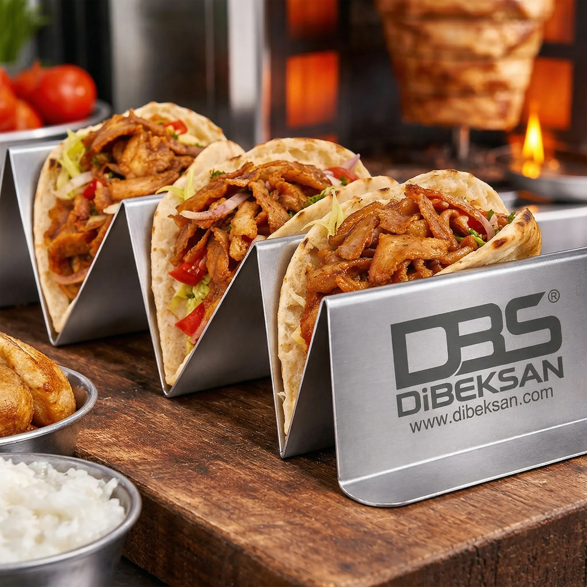 DA-39 Doner Kebab Serving StandDeveloped by DİBEKSAN engineering, this equipment aims to raise both the speed and visual standards of the modern gastronomy world. Particularly effective in group services and high-traffic establishments, it simplifies operational processes. Chubby doner kebab, tacos, hamburgers, and taco wraps. It is optimized for presenting products that need to maintain their shape. With a total length of 36 cm and a width of 12.5 cm, it stands stably on serving trays, while the 8 cm wide serving channels ensure that even large portions of food reach the table without tipping over.