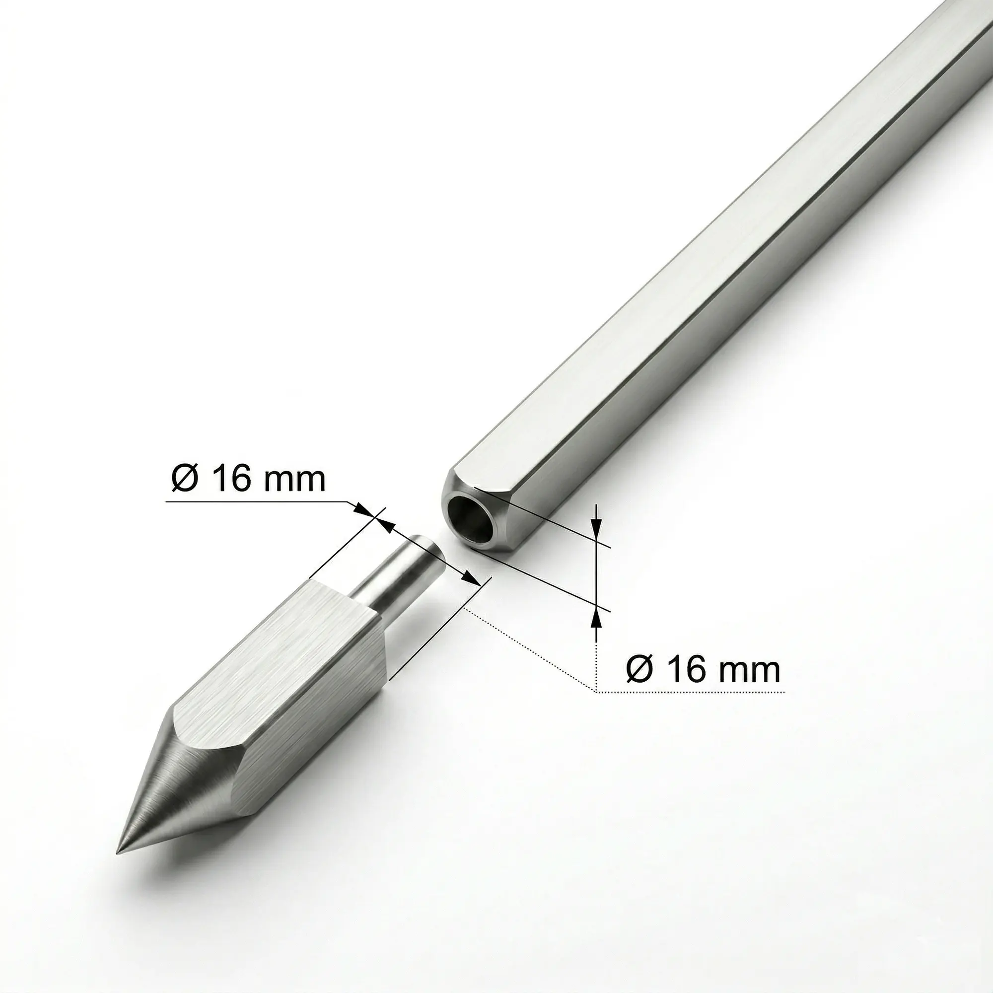 The DA-50 stainless steel pointed skewer tip, with its 16mm compatibility and AISI 304 steel construction, sharpens blunt skewers and facilitates meat threading.
