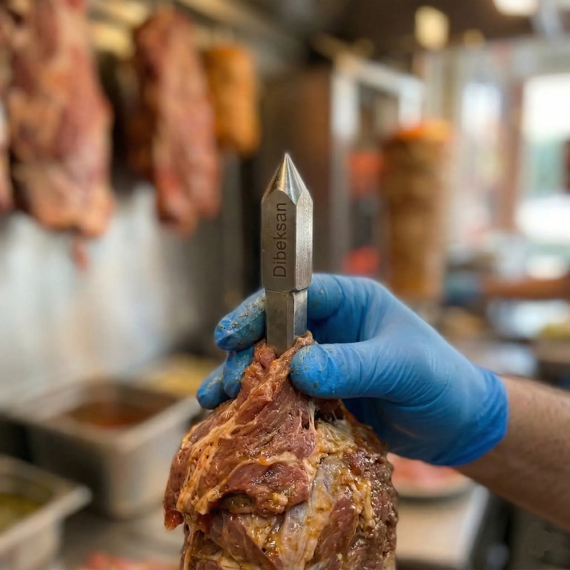 DA-50 Stainless Steel Pointed Skewer TipThis is a technical accessory specifically developed to eliminate the meat arrangement difficulties encountered in industrial doner kebab preparation processes. This compact replacement part, with a total length of 7 cm, 16 mm thick perforated doner kebab skewers By being easily assembled, it provides high penetration capability to blunt or standard-tipped skewers. During the preparation of döner kebab blocks, threading the meat slices onto the skewers requires considerable physical strength and precision. When using the DA-50 pointed skewer tip, a rapid threading process is achieved without damaging the fiber structure of the meat or experiencing volumetric loss of shape. Thanks to this device, operational speed and efficiency in the production process are maximized.