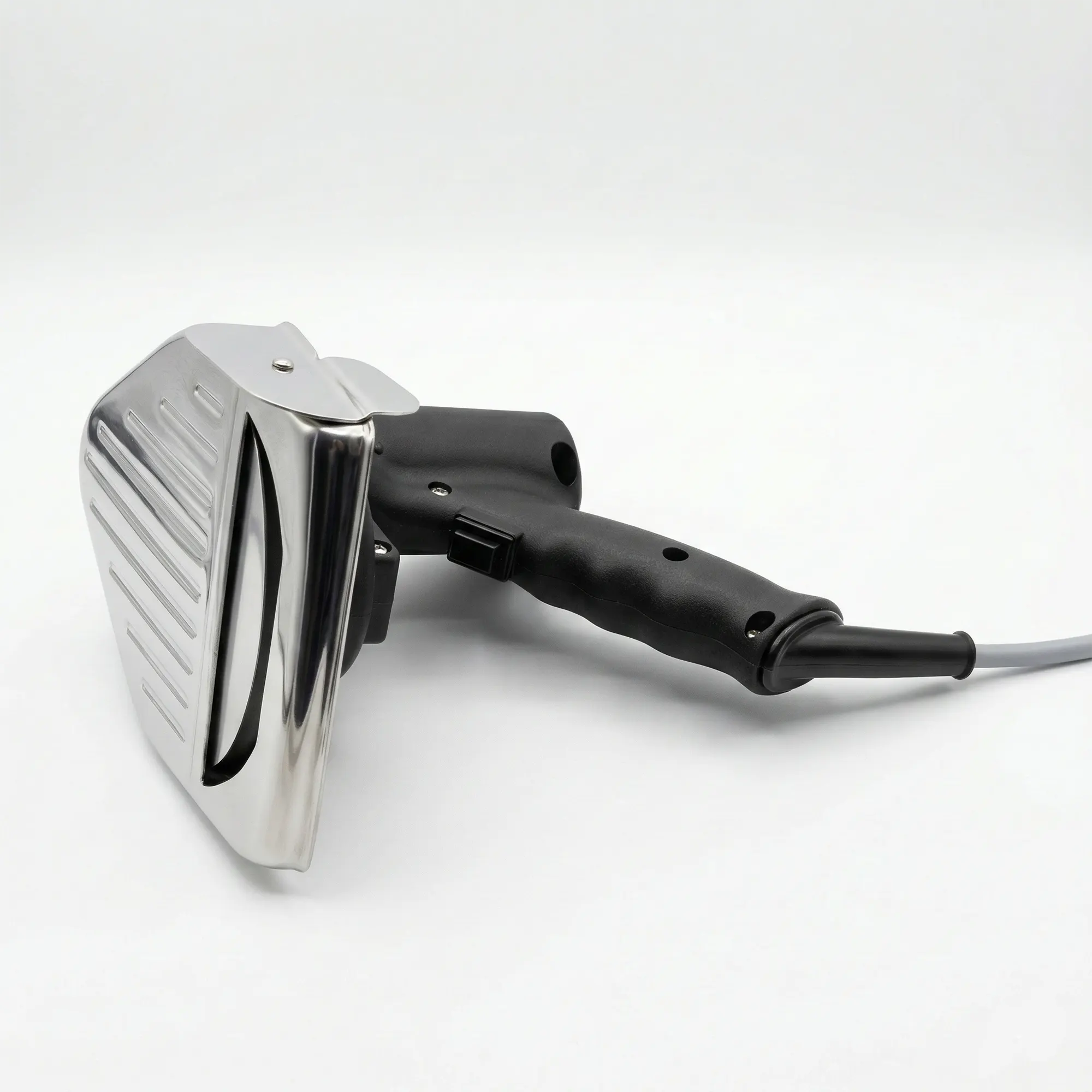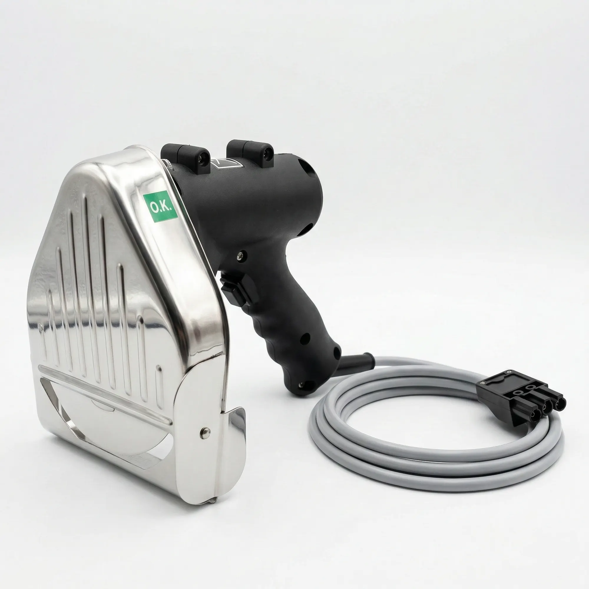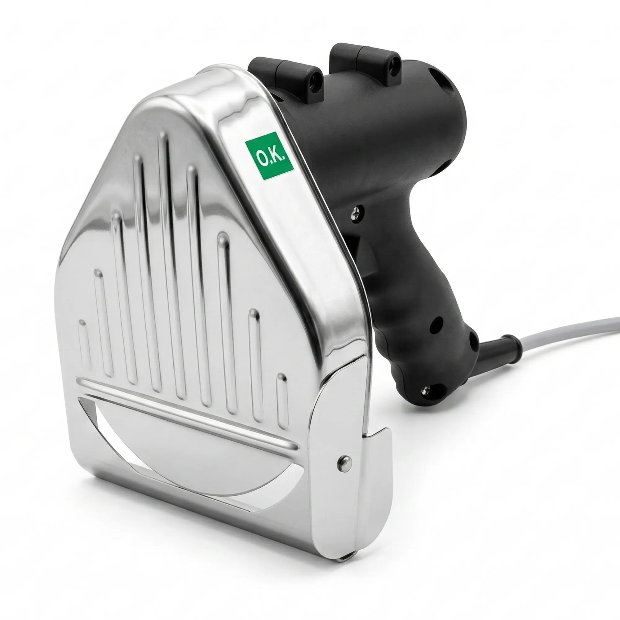 Seguridad alimentaria y salud del usuario, JET 120-MCuchillo Eléctrico Para Shawarma Constituye la base de la filosofía de diseño. En todas las superficies metálicas que entran en contacto con la carne. Acero inoxidable de grado Cr-Ni AISI 304 L Esta tecnología garantiza el cumplimiento de los estándares internacionales de higiene. La carcasa de plástico de alta resistencia, soportando hasta 180 °C, protege el mecanismo interno del motor del calor intenso que emite la parrilla, asegurando un funcionamiento higiénico, seguro y duradero. Su diseño de bajo voltaje de 12 V minimiza los riesgos eléctricos en ambientes húmedos de cocina, maximizando la seguridad de los empleados.