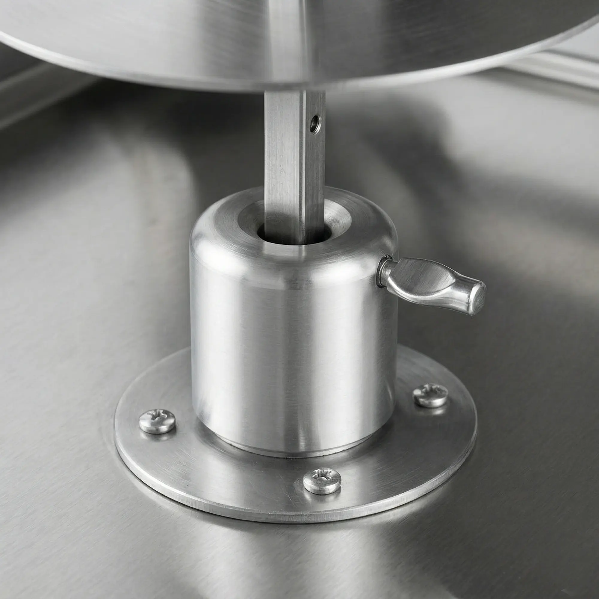 Completamente Fabricado en acero inoxidable grado AISI 304. Su estructura fabricada cumple con los más altos estándares de seguridad alimentaria. El perno, que ofrece una resistencia superior al calor radiante intenso y a los ambientes de trabajo grasientos, se puede desmontar e instalar fácilmente a mano sin necesidad de herramientas técnicas gracias a su diseño ergonómico. El acabado liso de su superficie facilita la limpieza, garantizando un uso prolongado y un alto rendimiento en cocinas industriales.