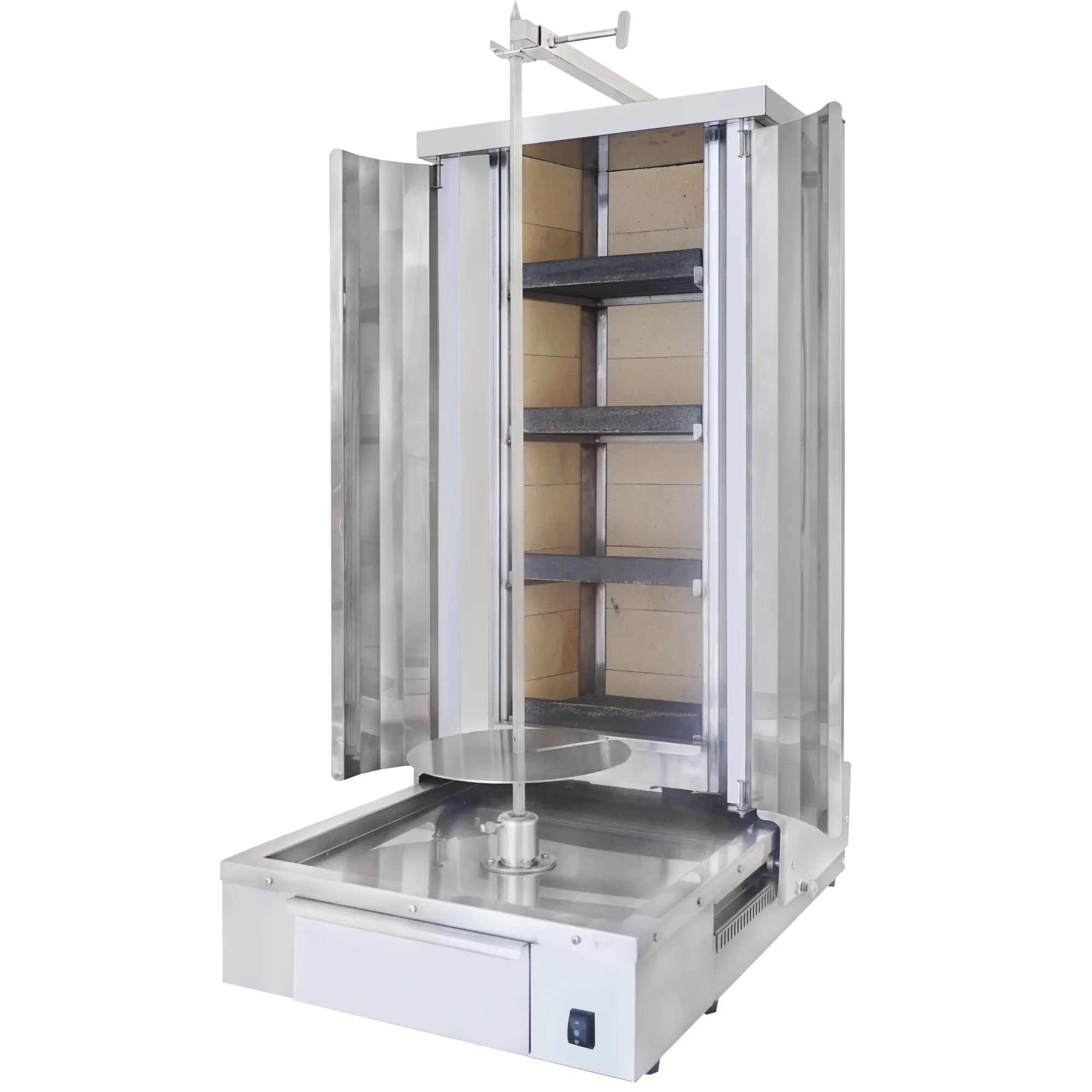 Ergonomie en servicesnelheid zijn fundamenteel voor de industriële ontwerpfilosofie van Dibeksan. Opwikkelmachinestandaard inbegrepen bij ons product. sleufschijfsysteemHet voorkomt personeelsverlies tijdens piekuren doordat u de döner binnen enkele seconden van de grill kunt halen. Het stille, aan de onderkant gemonteerde motormechanisme draait de zware dönerblokken soepel rond, terwijl de bediening in twee richtingen het gebruiksgemak vergroot. De hybride constructie behoudt zijn vorm zelfs bij extreme temperaturen, waardoor de levensduur van het apparaat wordt gemaximaliseerd en energie (brandstof) wordt bespaard.