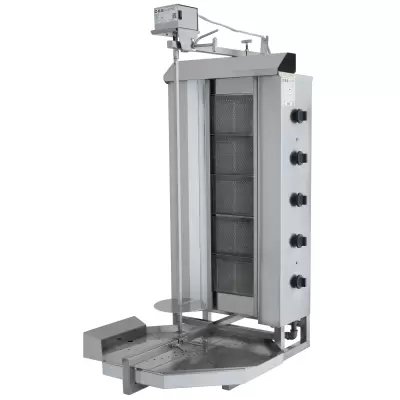 Urządzenie DMUG 405 o dziennej wydajności przetwórstwa mięsa (kebab) wynoszącej 100 kg zapewnia wysoką wydajność w dużych restauracjach i kuchniach hotelowych dzięki szerokiej konstrukcji i 5 mocnym promiennikom ciepła.