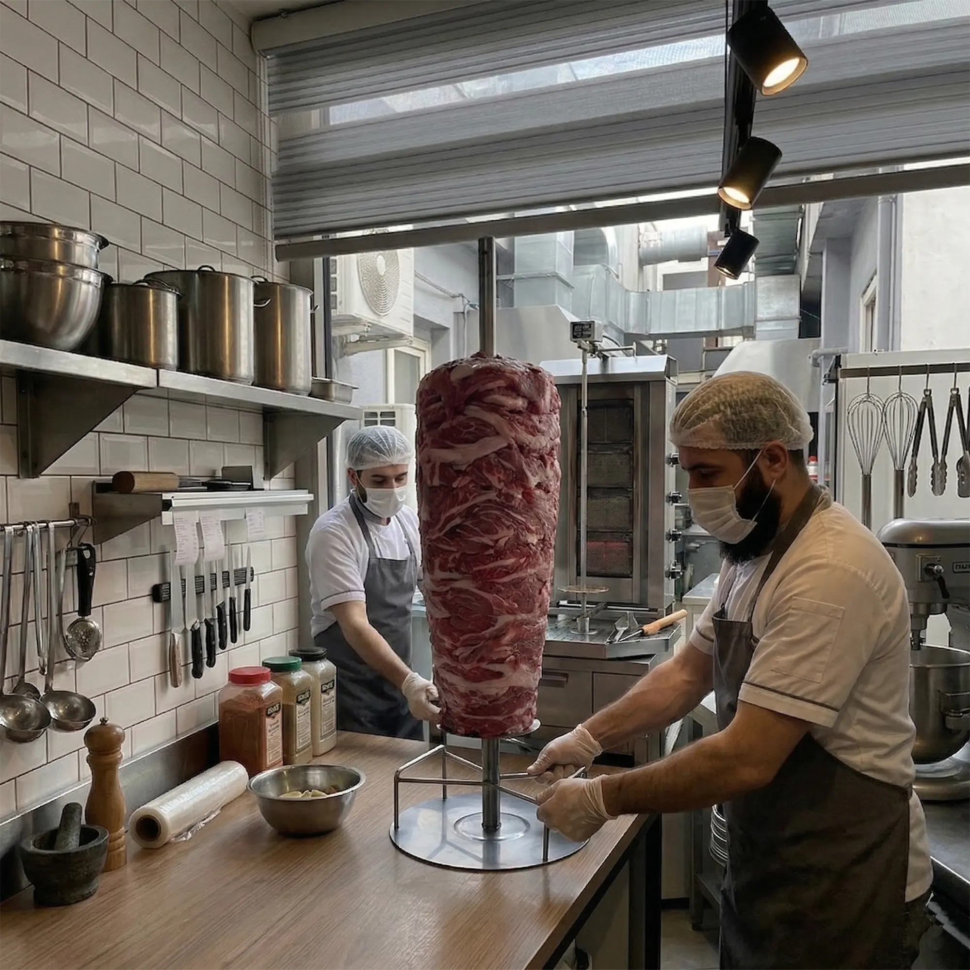 Duas alças posicionadas uma em frente à outra facilitam a transferência dos pesados blocos de kebab döner já preparados para a grelha.