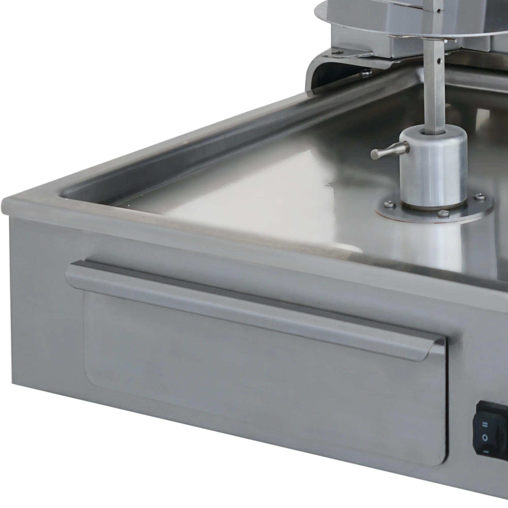 Operasyonel güvenlik ve gıda hijyeni kriterlerini en üst düzeyde karşılayan DMAE 205 şavarma makinesi, gıda tüzüğüne uygun AISI 304 kalite paslanmaz çelik gövdesi, 2 litrelik yağ depolama çekmecesi ve delikli süzgeç tepsisi ile donatılmıştır. Elektrik tesisatında yaşanabilecek risklere karşı entegre edilen koruyucu sigorta sistemi, çift yönlü dönebilen motoru ve ana devreyi güvence altına alarak cihazın arızalanmasını engeller. Hareketli paslanmaz gövde yapısı (Kızak Sistemi), etin hacmine göre pişirme mesafesinin operatör tarafından anlık olarak ayarlanmasını sağlayarak lezzeti garanti altına alır. Tüm bu endüstriyel donanımlarıyla CE sertifikasına sahip olan cihaz, küresel B2B ortaklarımız için verimli ve estetik bir çözümdür.