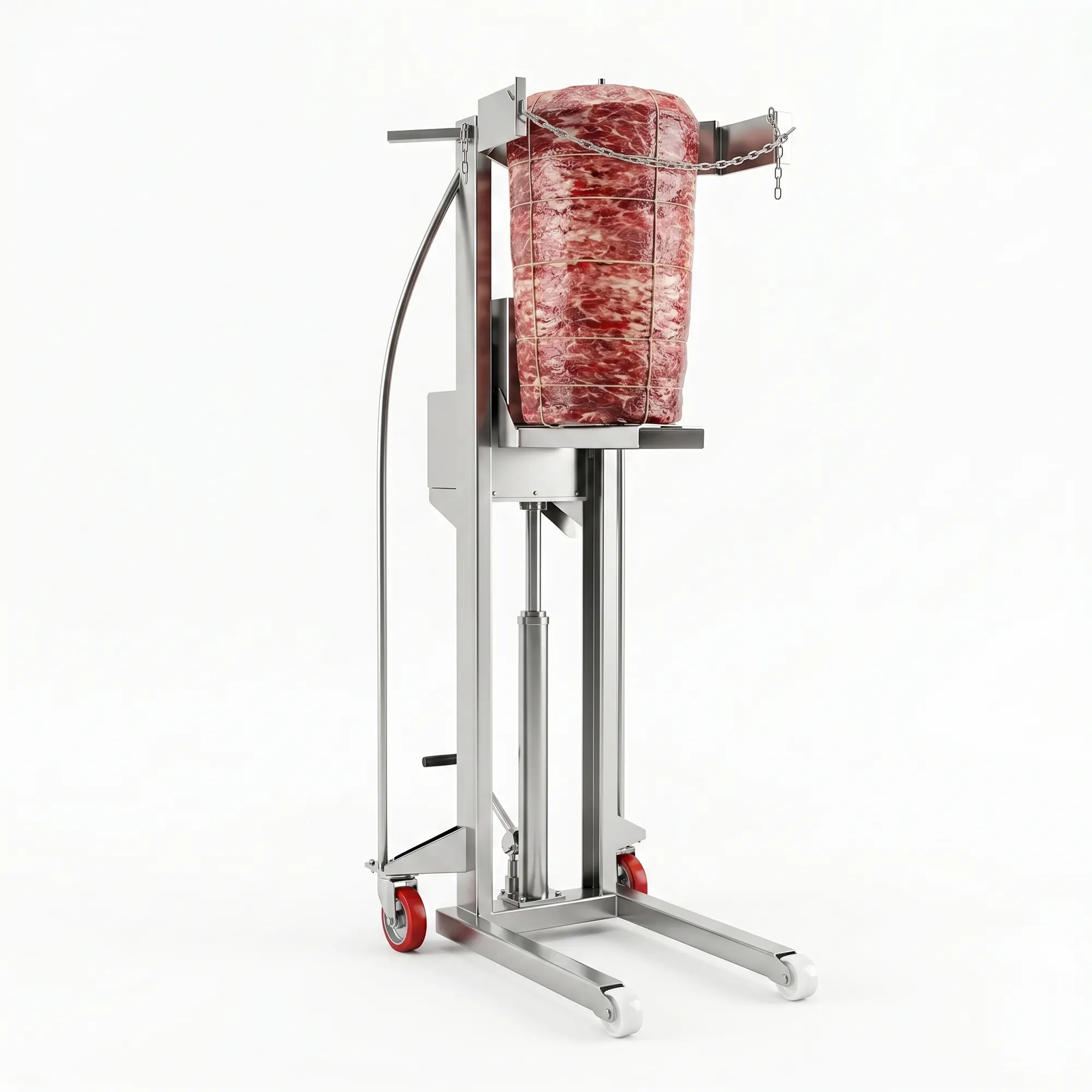 DS-239 döner taşıma lifti; 260 kg kaldırma kapasitesi, mobil yapısı ve AISI 304 çelik gövdesiyle ağır et transferini kolaylaştırır.