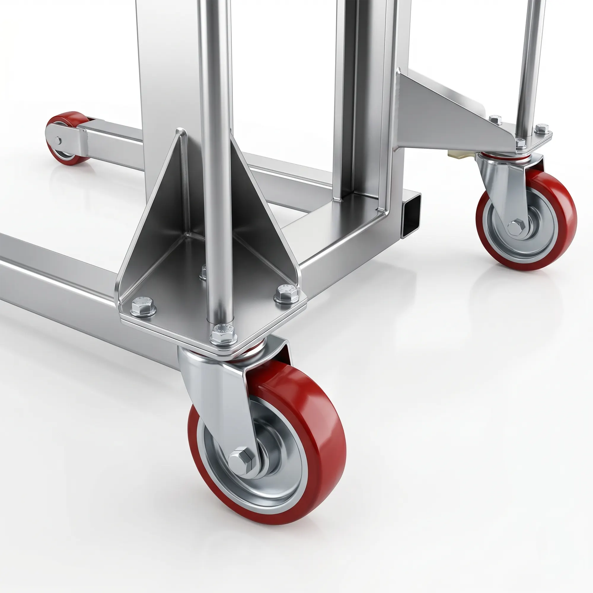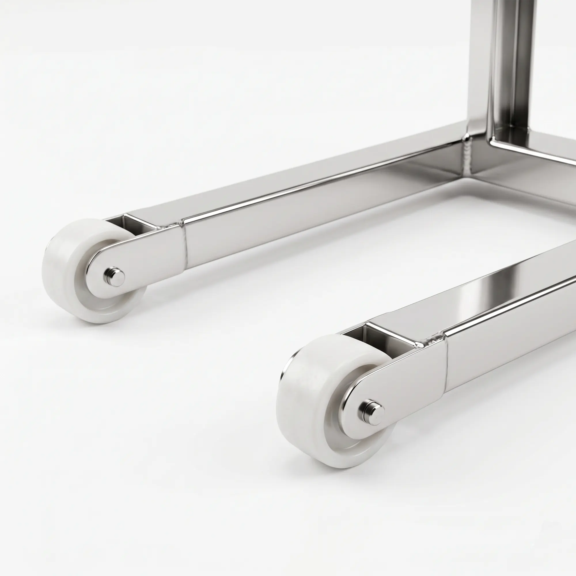 Kompakt gövde tasarımı (660 x 855 x 1700 mm) ve yüksek manevra kabiliyetine sahip sağlam tekerlekleri, dar mutfak koridorlarında dahi kusursuz bir mobilite sunar. Maksimum 150 cm kaldırma yüksekliği, döner bloklarının farklı ocak tiplerine mükemmel hizada yüklenmesini kolaylaştırır. Ürünün hareketli ve sabit tüm aksamları gıda tüzüğüne uygun AISI 304 kalite paslanmaz çelikten imal edilmiştir. Çiğ et sıvısına, yoğun neme ve ağır mutfak şartlarına karşı tam bir korozyon direnci sağlayan bu yapı, aynı zamanda su ve standart mutfak kimyasalları ile hızlıca temizlenebilir. 65 kg net ağırlığıyla stabilizasyonunu koruyan DS-239, iş gücü maliyetlerini düşürürken operasyonel iş güvenliğini en üst seviyeye taşıyan stratejik bir demirbaştır.